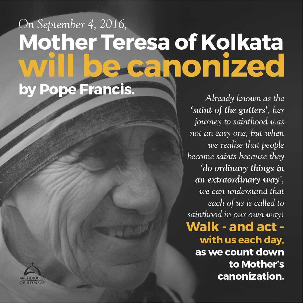On September 4, 2016, Mother Teresa of Kolkata will be canonized by Pope Francis. Walk - and act -with us each day, as we count down to Mother’s canonization.
